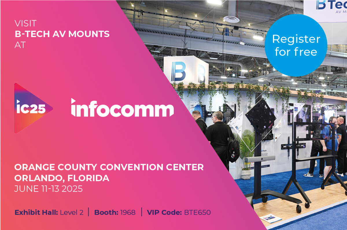 B-Tech AV Mounts LLC returns to Florida to showcase at InfoComm 2025 We’re excited to announce our return to the East Coast as B-Tech AV Mounts exhibits at InfoComm 2025, North America’s premier professional AV trade show. Taking place June 11–13 at the Orange County Convention Center in Florida, the event will attract thousands of integrators, manufacturers, resellers, and end-users from around the world. Visit us at Booth 1968 to explore our latest innovations, including System Xpress, our revolutionary dvLED mounting solution designed specifically for latching cabinets. With fixed pricing, rapid availability from stock, and supplied as a standard product, System Xpress dramatically reduces lead times and simplifies installation. Its Xpress Connect twist-lock clips hook onto the supplied mounting rails and secure with a simple quarter-turn—enabling fast and easy assembly for wall-, floor-, or ceiling-mounted dvLED displays. It’s our fastest dvLED solution from order to install, and it will be demonstrated alongside our trusted System Xpert, giving visitors the chance to compare both systems and choose the best fit for their projects. We’ll also be showcasing dedicated mounting solutions for Samsung’s E-Paper and 110" All-in-One displays, along with our new Vantage range of premium wall mounts featuring B-Tech’s exclusive Ultra-Glide Tilt technology. Other product highlights can be seen in our full preview below. Plus, don’t miss the return of our crowd-favorite Pro Striker Game, powered by the BT8312 pop-out mount, with chances to win great prizes! InfoComm 2025 Show Preview  dvLED Mounting Solutions After a sneak peek at InfoComm 2024, we’re proud to officially launch System Xpress - our revolutionary new dvLED mounting system. With fixed pricing and universal, stockable components, System Xpress is built for speed and simplicity. Stop by for a live demo and see the difference first-hand.  AV Media Device Storage Solutions Get hands-on with our innovative range of AV Storage Solutions. Whether you need a standalone unit or an all-in-one wall mount with pull-down or slide-out functionality, we’ve got you covered. Key features include: Toolless Tray Release: Ensuring quick access and seamless ‘hot-swapping’ of equipment. Integrated Cable Management: Preventing cable tangles and pinching for a hassle-free setup. These solutions are designed for efficiency, flexibility, and ease of use.  Momentum Stands and Carts Introducing the Momentum range of trolleys and mobile AV supports, including: - BT8559 Momentum Motorized Height Adjustable Floor-to-Wall Stand