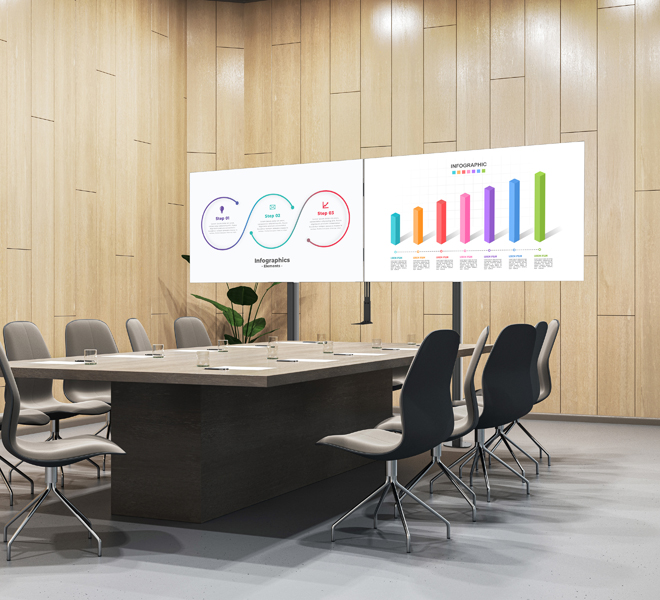 | BT8528 XXL Twin Screen VC StandFreestanding solution for twin screens up to 86" (220cm) | BT8518 XXL Twin Screen VC TrolleyMobile solution for twin screens up to 86" (220cm) |