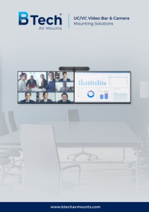 B-Tech AV Mounts 2 UC / VC Video Bar & Camera Mounts B-Tech’s reputation as the go-to brand for professional AV mounting solutions is built off the back of our huge range of specialist solutions for each area of industry. Our suite of mounts for the VC/UC space is no exception and we have designed and manufactured a range of mounting plates and adaptors designed specifically to mount Video Bars, Soundbars, VC cameras and a range of other devices. These are all available from stock and can be fitted to a wide selection of B-Tech wall mounts, stands and trolleys. With options to fit the device above or below the display, end users will experience a robust, yet flexible mounting solution to suit their conferencing needs and the installation process will be smooth and hassle-free for the integrator. Solutions available for all major brands, including: For the most up-to-date brand listings visit B-Tech's website or contact us at technical@btechavmounts.com