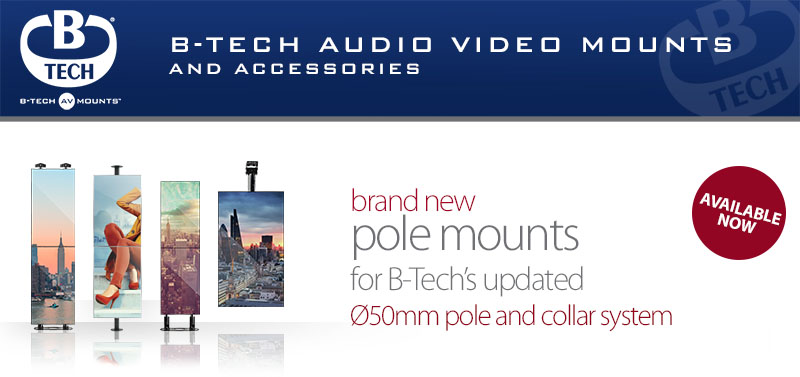 As part of the update to our Ø50mm pole and collar system, B-Tech are pleased to announce the launch of four brand new pole mounts which are ideal for a range of floor, ceiling or wall mounted setups. The range includes the BT7806 Ceiling/Floor Mount and a twin pole version - BT7807, both of which are made from heavy duty steel which is capable of supporting large, weighty installations. Both can be ceiling mounted, bolted to the floor, or used as a complete floor-to-ceiling install if desired. The BT7831 is a wall mounting bracket that works in conjunction with floor/ceiling mounts to create floor-to-wall and ceiling-to-wall installs. Alternatively, two of these can be used to fix poles straight onto the wall without needing any floor or ceiling fixings. The BT7808 is a ceiling mount with an adjustable tilt range of up to 90°. This makes it ideal for installs on to angled ceilings and also allows poles to be fitted onto walls in both horizontal and vertical configurations. |