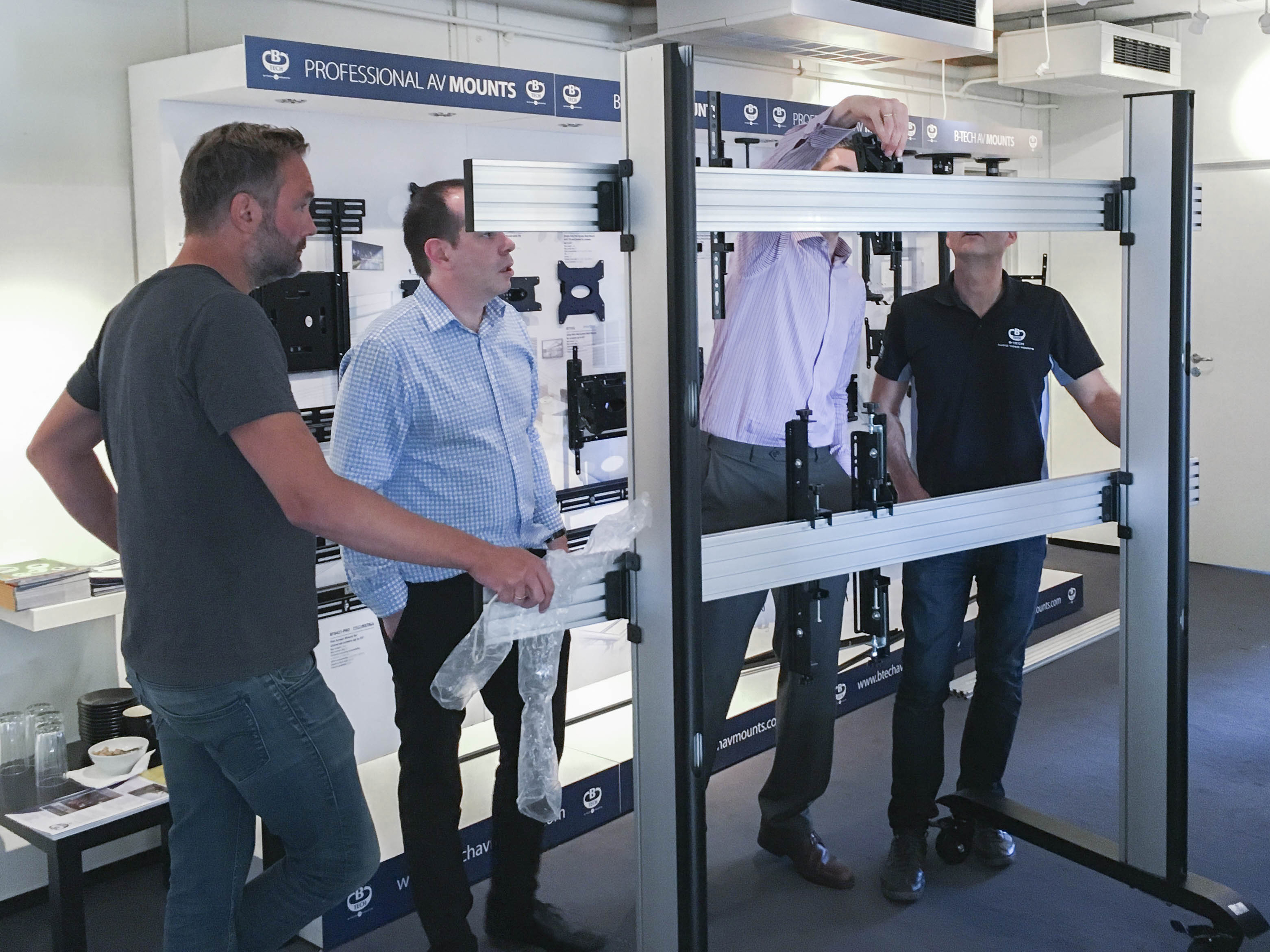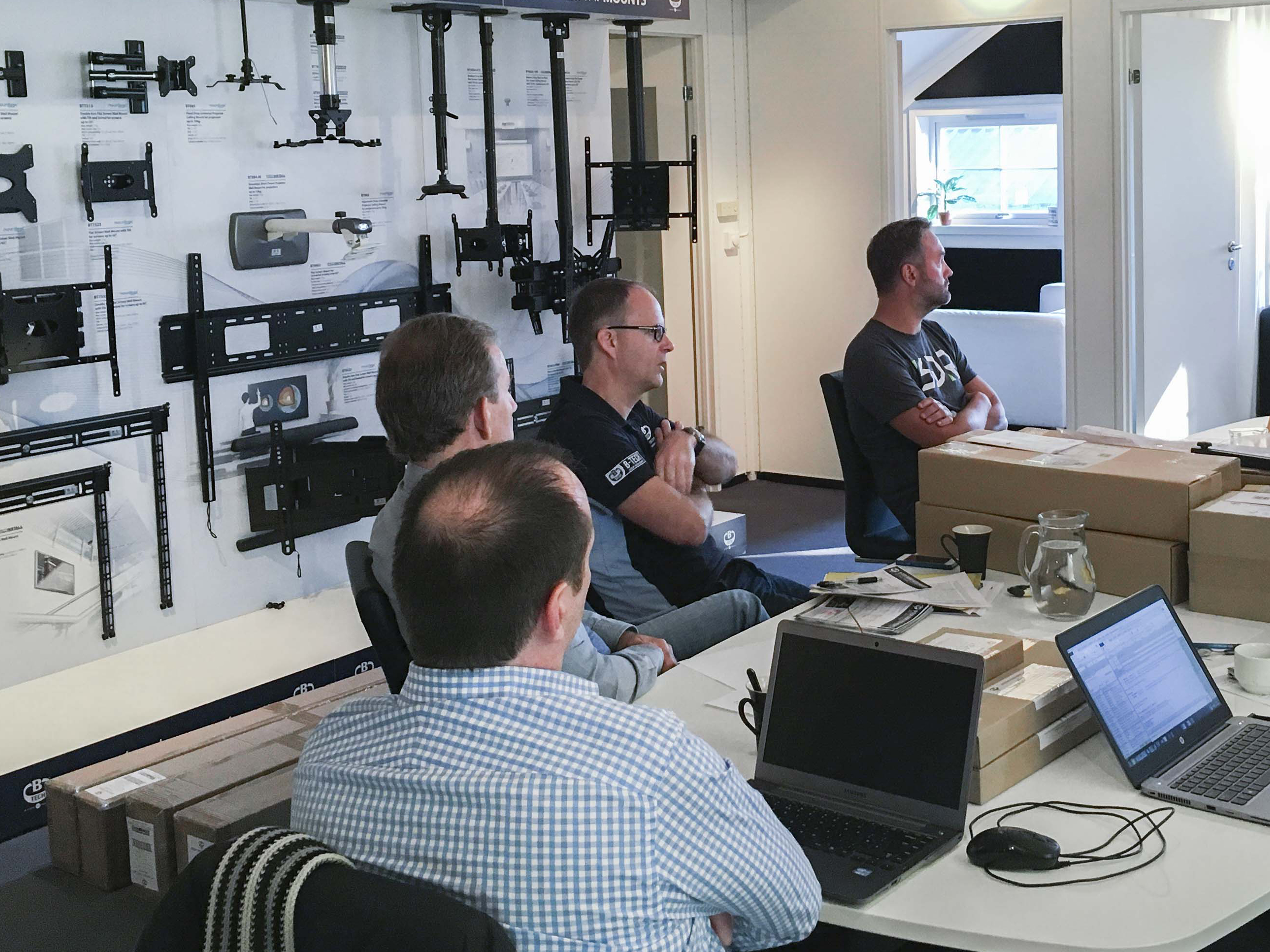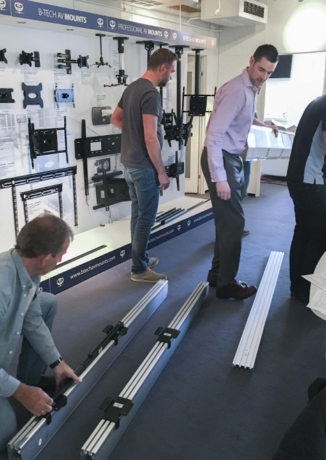 System X on tour sees Norwegian training day and showroom opening B-Tech staff from the UK, including managing director Matt Bennett, global business development manager Mark Walker and export area sales manager Paul Haggarty, continued the ‘System X on tour’ programme with a training day at Norwegian distributor Interconnect. The day coincided with the official launch of a new B-Tech International showroom at Interconnect’s headquarters on the North West outskirts of Oslo. The day’s training saw one of Norway’s leading technology distributors getting hands on with the full range of System X products, allowing their specialists to see for themselves the benefits of B-Tech’s versatile new display mounting system. Mark Walker said: “The feedback we’ve received from Norway has been excellent. There is an excitement about System X that seems to be contagious. It was great to bring the range to our Norwegian partners and the new displays look impressive in our new dedicated B-Tech showroom”. He added: “It was a really productive day and I want to thank the great bunch of people at Interconnect for the warm welcome received for both us and our products”. If you’re yet to see System X, you can catch us showcasing this exciting range at various upcoming events, including InfoComm Dubai and ISE 2016. Alternatively, we can come to you - simply call Mark Walker on 07507 776044 to arrange a demonstration. |