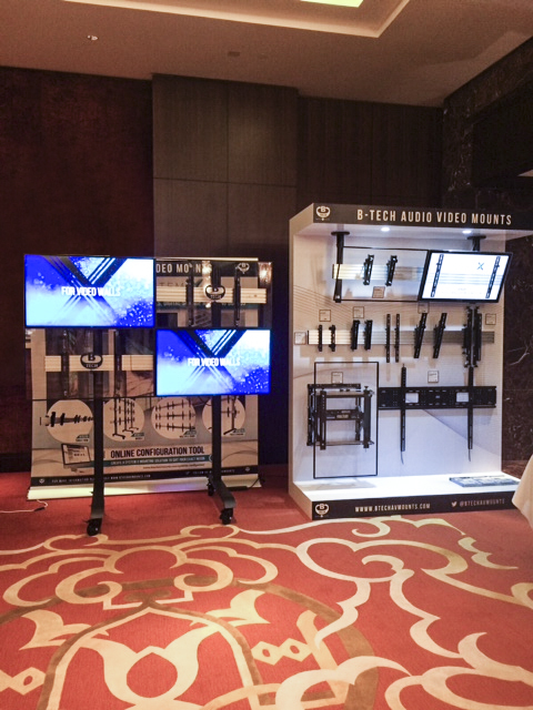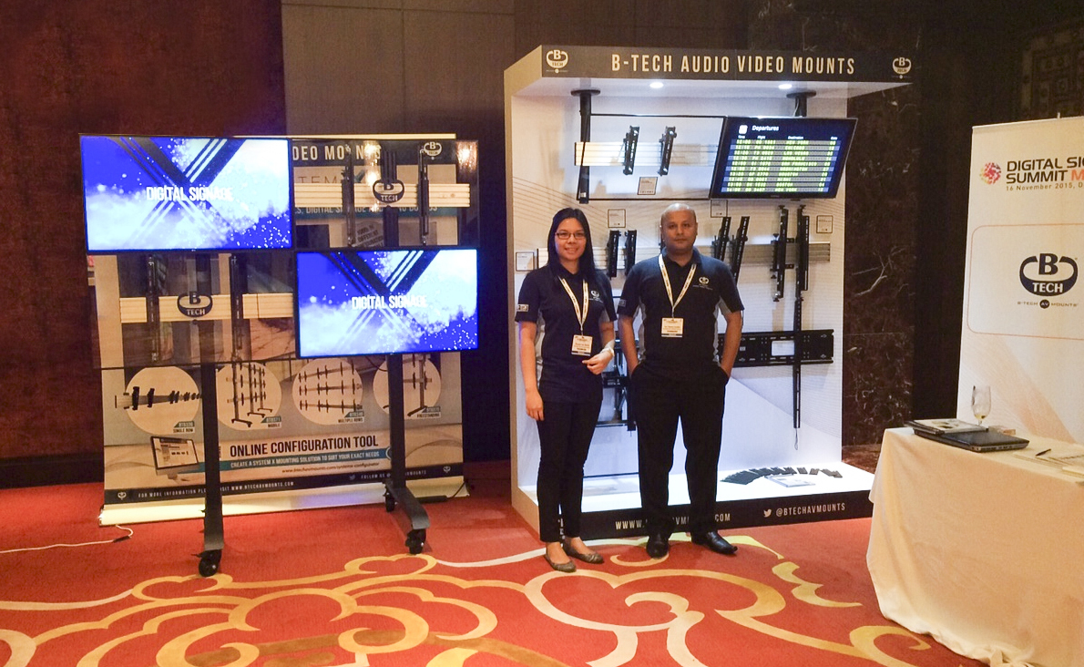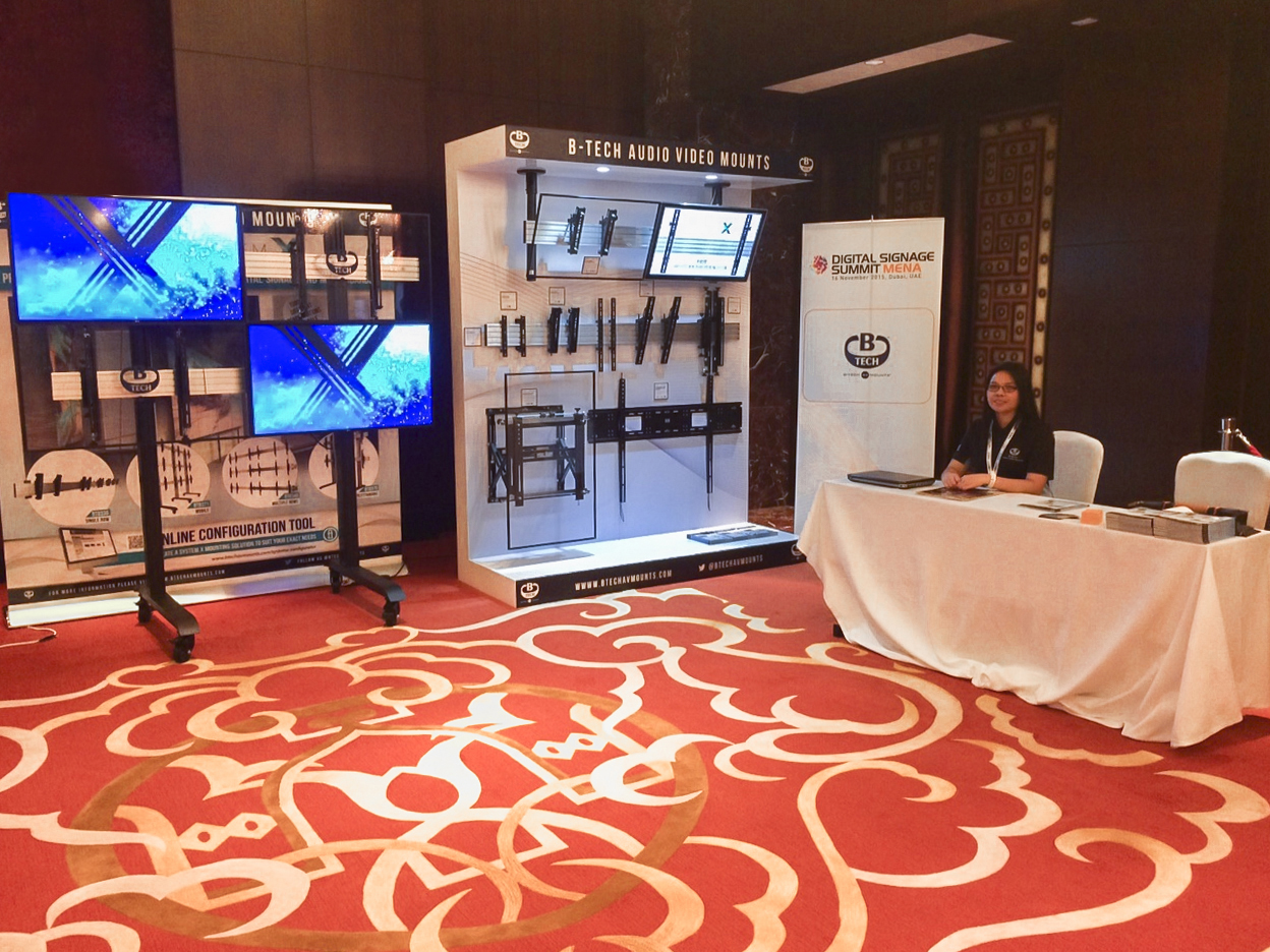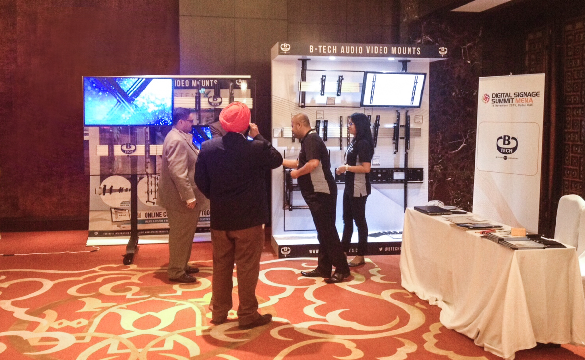 Dubai serves up a successful Digital Signage Summit B-Tech enjoyed a return to Dubai for the 2015 Digital Signage Summit MENA. Staged at the Conrad Hotel, the day saw a full programme of insightful industry seminars ranging from retail and showroom trends to customer experience and interactive marketing. The exhibition area saw B-Tech showcase the recently launched System X range, along with other screen and video wall mounting solutions that are key to the digital signage market. Kit list: BT8371-2x2 - System X Universal Mobile Video Wall Stand BT8330 - System X Universal Menu Board Mounting System BT8390-175 - System X demonstration rail to demo range of System X interface arms BT9903 - Heavy Duty Universal Flat Screen Wall Mount BT8310 - Professional Video Wall Mount with Quick Lock Push System Digital Signage Summits, organised by Integrated Systems Europe, are staged periodically around the globe and this event, covering Middle East and North Africa saw a welcome return to the region for B-Tech’s exhibition team following the InfoComm MEA and GITEX show in October. Jon Alway, Export Sales Manager for B-Tech, said: “We always enjoy exhibiting our products in the Middle East. We know, from feedback in Dubai, that the region continues to benefit from rapid growth in its digital signage offering and we are willing and able to support that growth with our strong, light and hassle free solutions, which are highly affordable thanks to support from our local offices in Dubai, which supply the full range of B-Tech products – all held in stock at the Jebel Ali Free Zone” Jon added: “It was a great event and the quality of the leads we receive from Middle East exhibitions is always high. It was clear from the numerous talk sessions at the event that digital signage has a bright future in the regions’ retail and transport markets and our new System X range is the perfect solution for in-store video walls and menu boards.” “Our System X products are proving to be a huge hit with customers, thanks to their high quality as well as the accompanying online configuration tool, which allows solutions to be specified for any screen size or configuration, in just a few clicks.” To discover more about B-Tech’s offering to the Middle East and Africa market, please contact: Joie Rull on: +971 4 3574855 / sales@btechavmounts.ae Qazi Hassan Ataullah on: +971 4 3574855 / q.ataullah@btechavmounts.ae  |