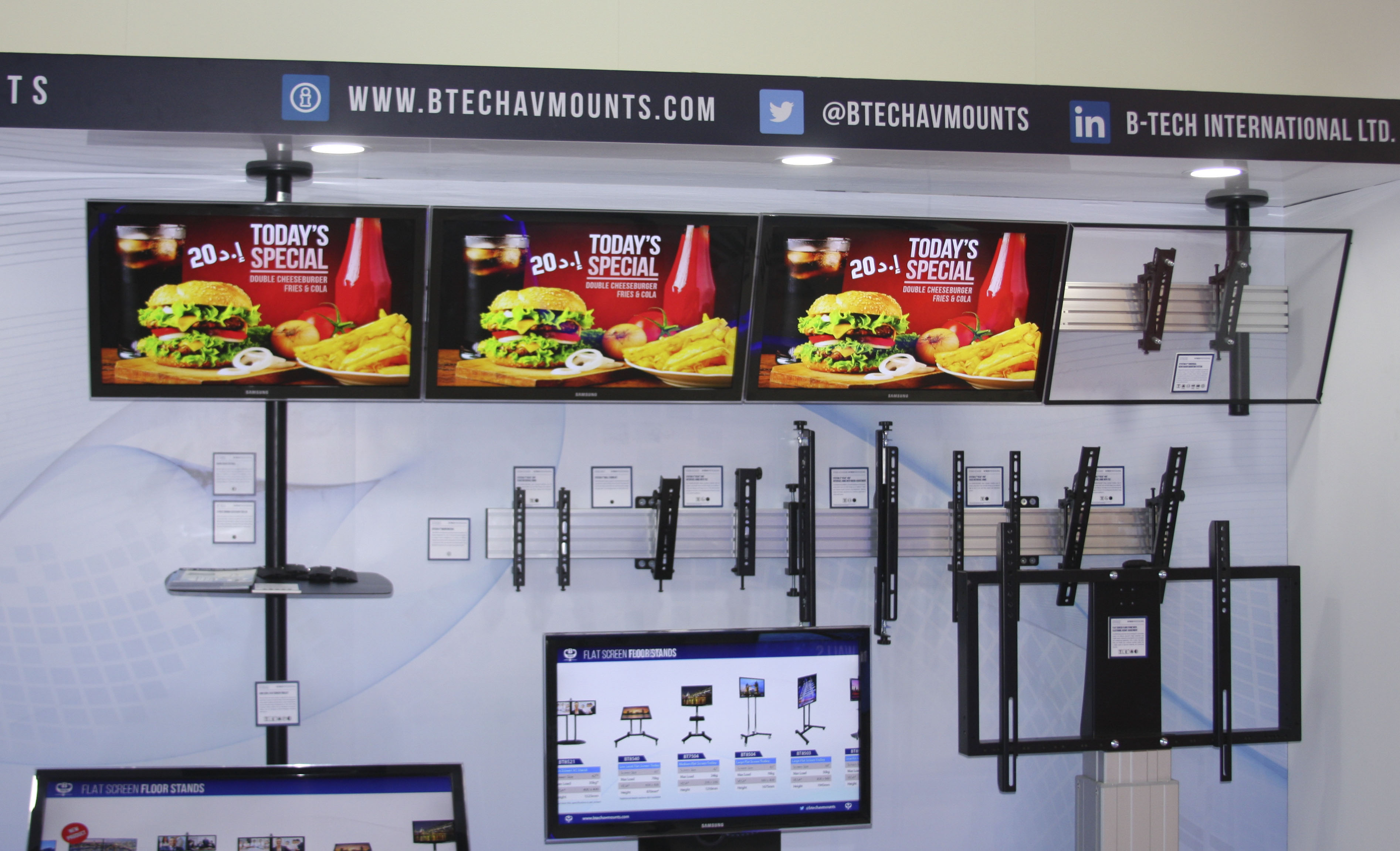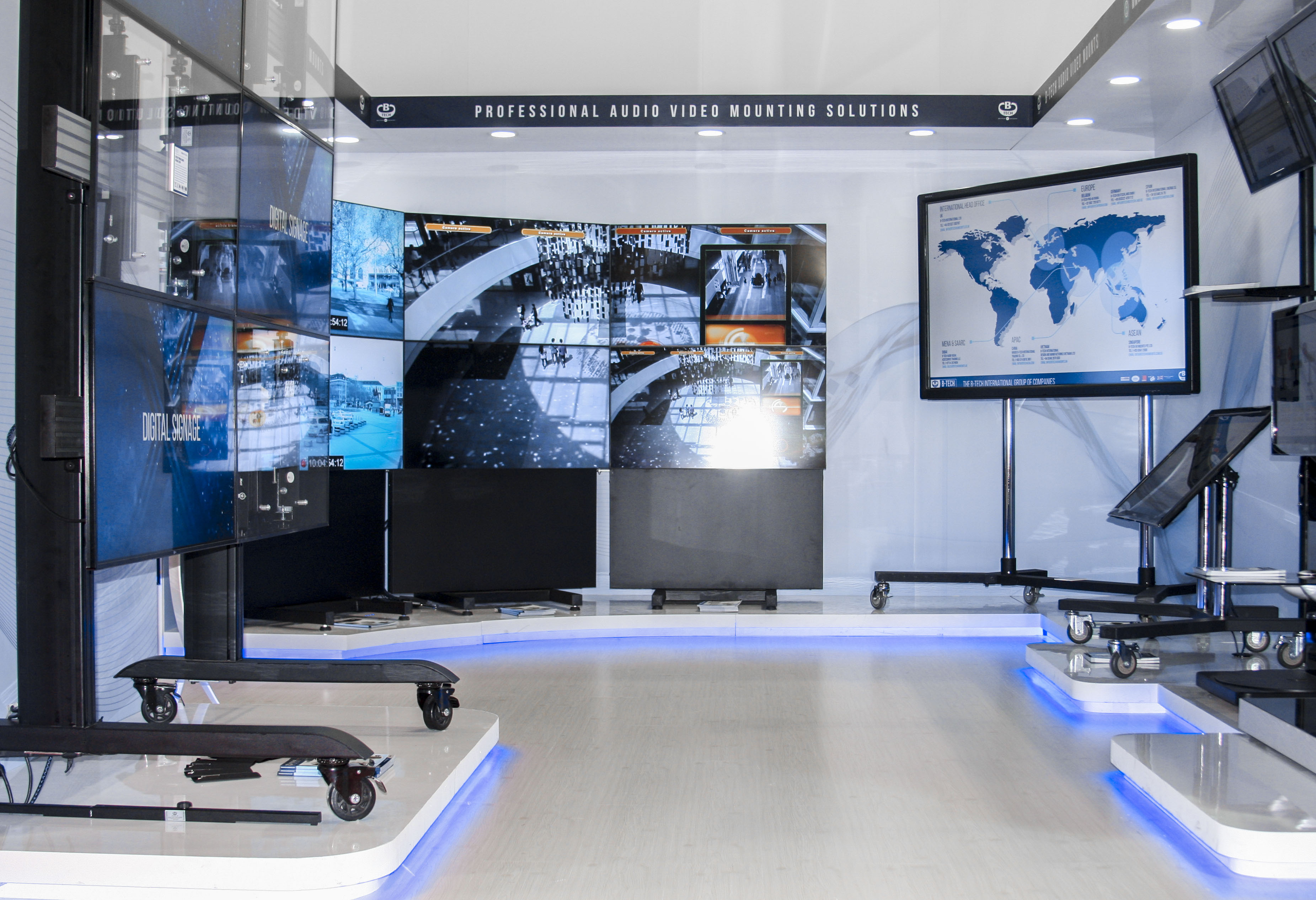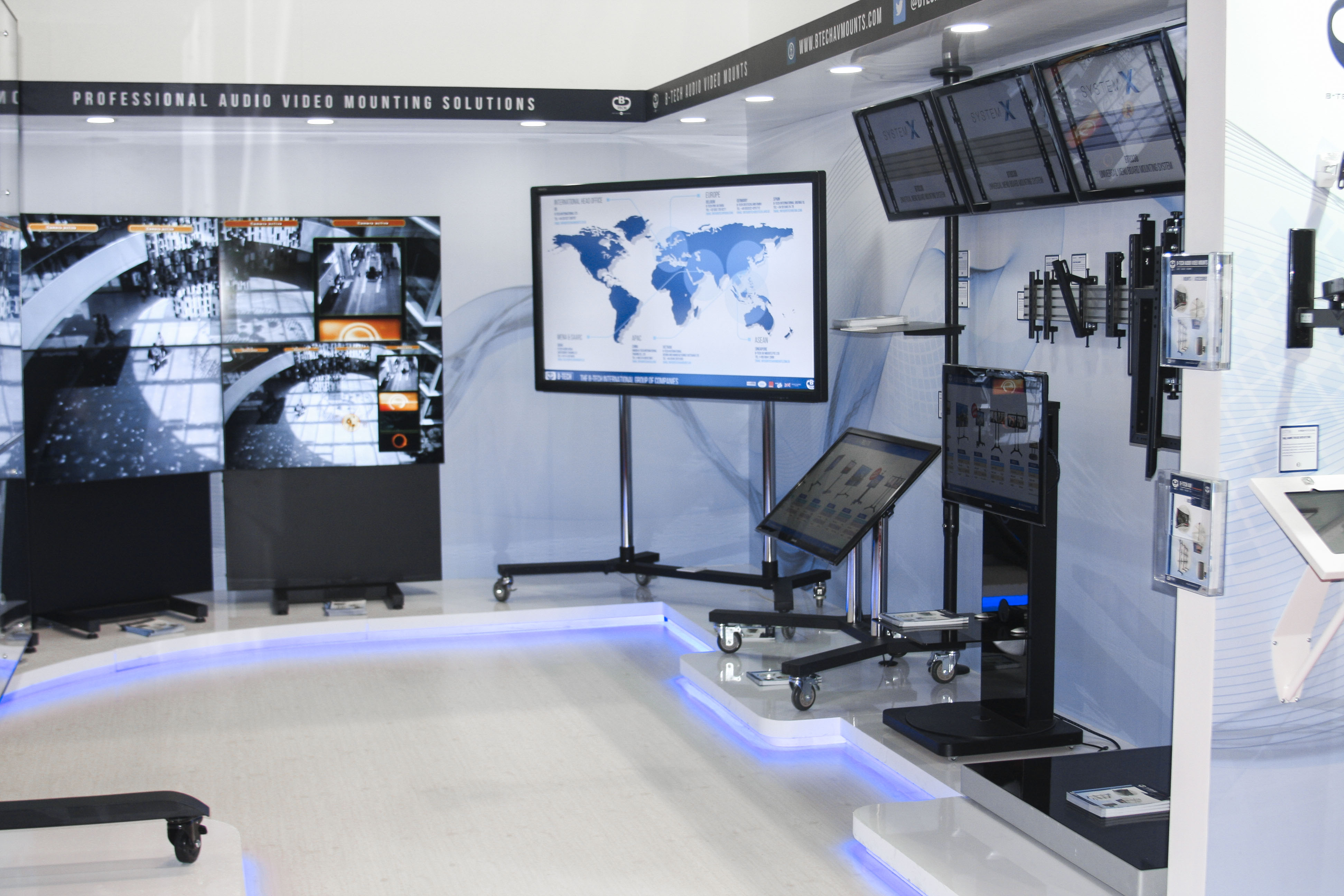 System X shines at InfoComm Middle East event The Middle East is the latest part of the world to host ‘System X on Tour’ as B-Tech showcased their impressive new range of video wall, menu board and digital signage mounts at a successful InfoComm MEA show. The four-day event in October, staged at the World Trade Centre in Dubai, is run as part of the GITEX technology week, making for one of the largest annual gatherings for the tech industry in the region. Giving System X maximum exposure, B-Tech invested in a high-end, eye-catching stand, which brought interest not only from the Middle East market, but also generated solid leads from Europe and the rest of the world. The show also marked the first anniversary of B-Tech’s Middle East subsidiary, where their reputation for quality and British engineering continues to thrive in a region that is demonstrating impressive growth.  Jon Alway, export sales manager for B-Tech, said: “The investment in our stand was certainly fitting for a product such as System X. We were able to display how the range can be used across a wide range of applications, covering numerous markets, and we were delighted to generate quality leads from the exhibition that we look forward to following up.” He added: “Over the past 12 months, we have seen B-Tech go from strength to strength in the Middle East and, with our local service, regionalised warehousing and showroom in Oud Metha, Dubai, we expect System X to be a popular part of the growing number of installations in the region.” The digital signage market is probably growing faster in the Middle East than anywhere else in the world and B-Tech are perfectly placed to meet this demand with their System X range. With a range that is available in over 2,000 configurations, System X can be utilised for applications ranging from a single screen to almost unlimited displays. To discover more on B-Tech’s offering to the MEA and SAARC region, please contact us using the details below: Joie Rull on: +971 4 3574855 / sales@btechavmounts.ae Qazi Hassan Ataullah on: +971 4 3574855 / q.ataullah@btechavmounts.ae  |