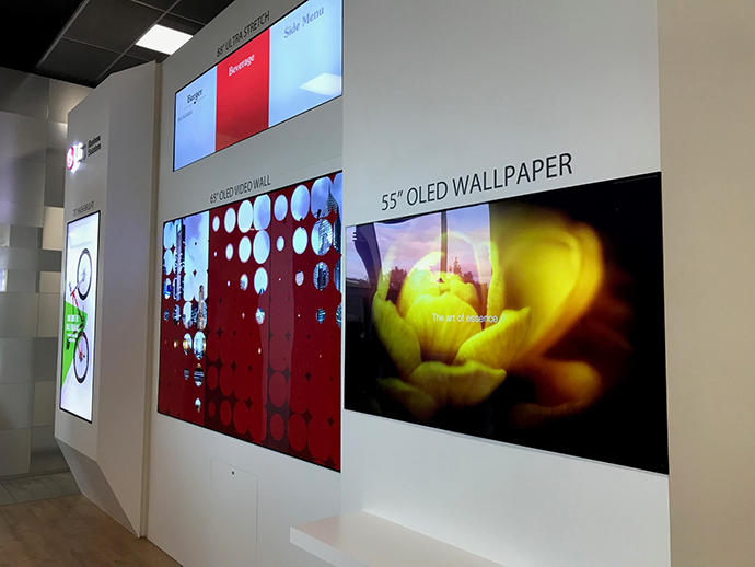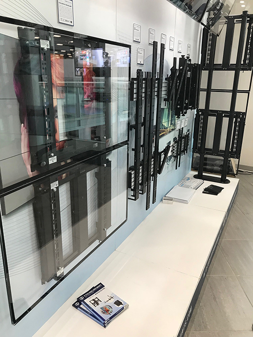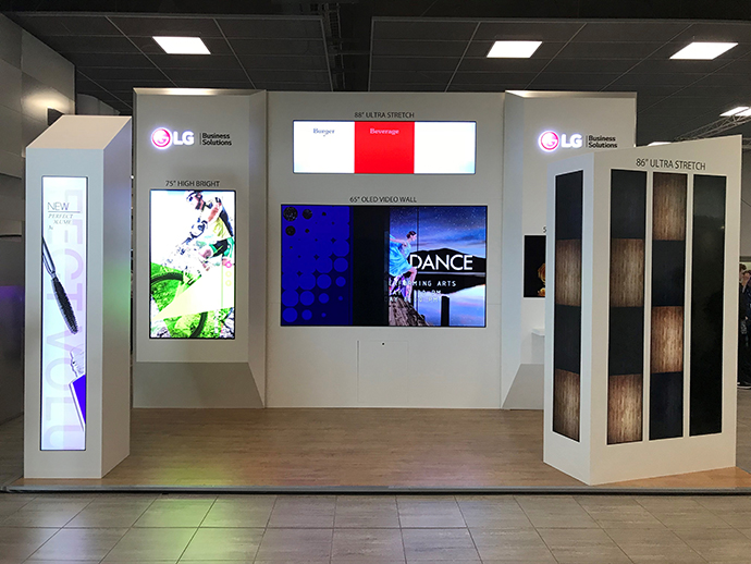 LG had an impressive stand, with their latest ultra-stretch signage flush-mounted using B-Tech BT9909 and BT8312 solutions.