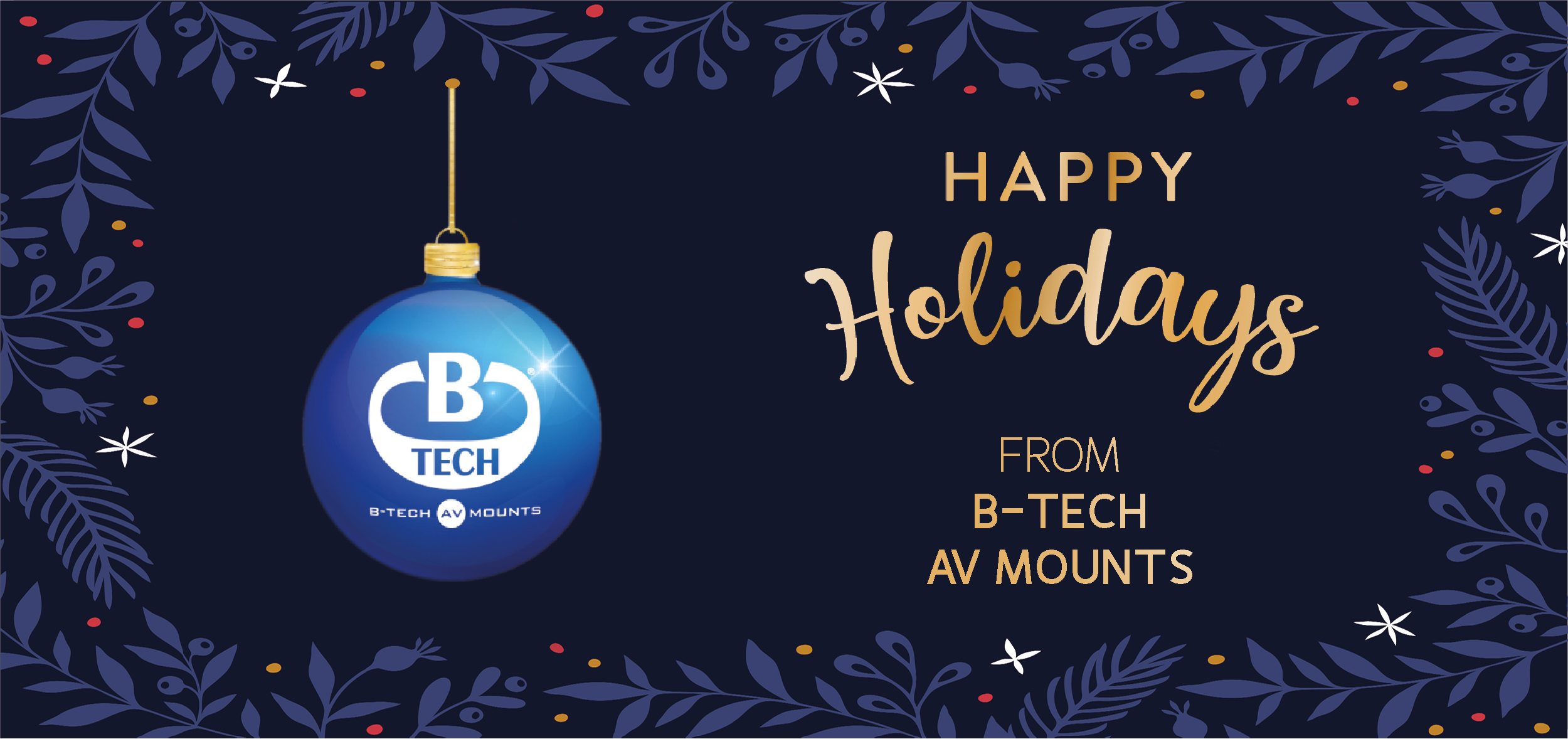 We wish season's greetings to all of our loyal customers. Thank you for your valued custom throughout the last twelve months. We look forward to working with you again in the new year. Please note our office opening hours over the festive period are as follows: B-Tech International Limited - United Kingdom December 24th (1pm) - January 3rd - Closed January 4th onwards - Open as usual B-Tech PRO-AV BVBA - Belgium December 24th (2pm) - January 2nd - Closed January 3rd onwards - Open as usual