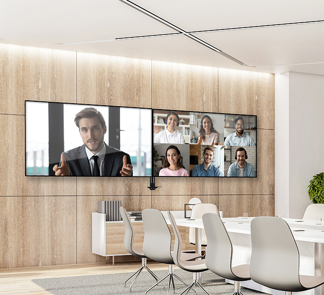 | BT8415 Twin Screen VC Wall MountDesigned to mount two screens up to 46" (117cm) | BTF845 Universal Twin Screen VC StandDesigned to mount two screens side by side for video conferencing applications |